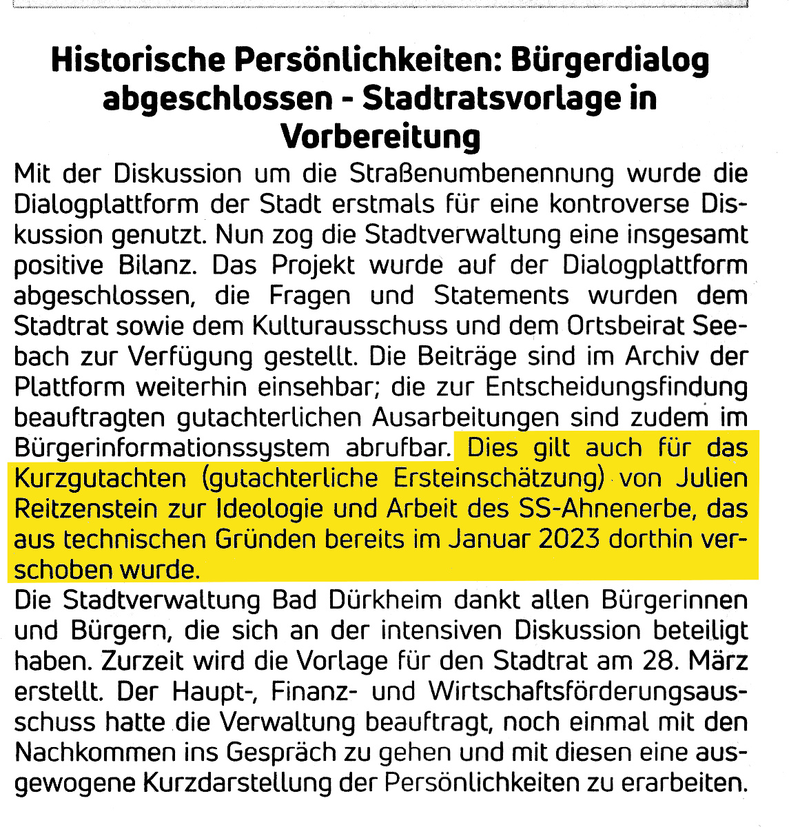 Unsere Briefe (es wurden sogar zwei) werden in der Stadtratssitzung vom 12.12. mit keinem Wort erwähnt. Der Stadtrat beschließt die Zusatzbeschilderung ohne Änderungen. Es ist die letzte Sitzung unter Leitung von Bürgermeister Glogger, die neue Bürgermeisterin Natalie Bauernschmitt, die sich bisher bei dem Dürkheimer Reizthema »Straßenumbenennung« zurückgehalten hat, wird gegen Ende vereidigt. Möge mit ihr ein neuer Wind in Stadtverwaltung und Stadtrat einziehen!