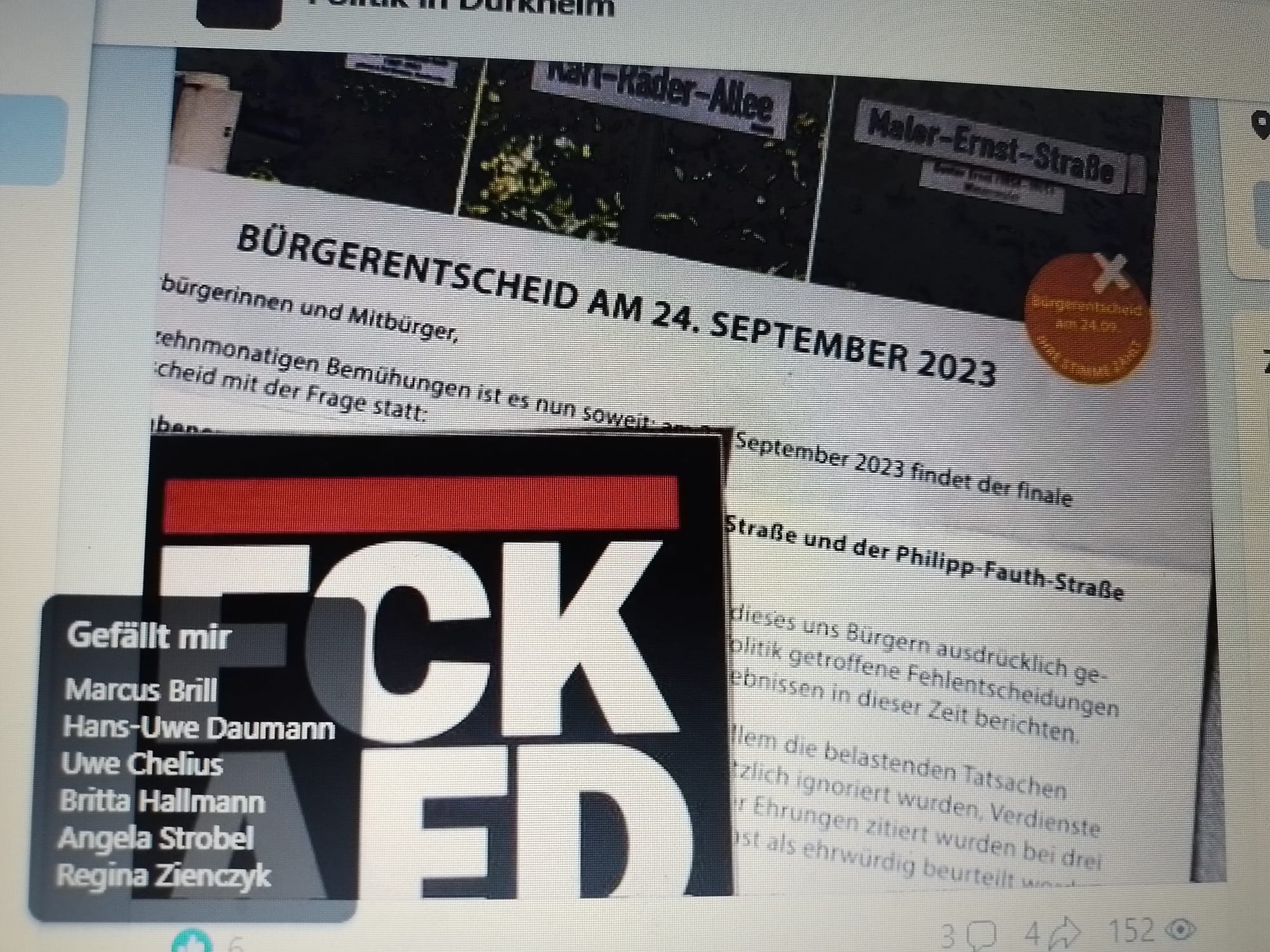 Am oder vor dem 03.09. postet der grüne Stadtratskandidat Robert Kröner die nebenstehende unflätige Schmähung der Bürgerinitiative (»FCK AFD« = »Fi*k Dich, AfD« auf dem Flugblatt der Dürkheimer Bürgerinitiative) in einer Facebook-Gruppe, womit ihm die Ehre zukommt, Gossensprache von Linksextremen in die Dürkheimer Kommunalpolitik eingeführt zu haben. Die wichtigen städtischen Mitarbeiter Dr. Britta Hallmann-Preuß und Marcus Brill, ebenso Angela Strobel, Vorsitzende der Freien Wähler Bad Dürkheim, liken umgehend diesen Beitrag (d.h. sie heißen ihn gut), und mit Uwe Chelius, dem Vorsitzenden der Arbeiterwohlfahrt Bad Dürkheim, und Regina Zienczyk vom sog. »Bündnis für Vielfalt und Toleranz« findet sich zwei weitere in Dürkheim bekannte Namen in diesem wenig toleranten Club ein.