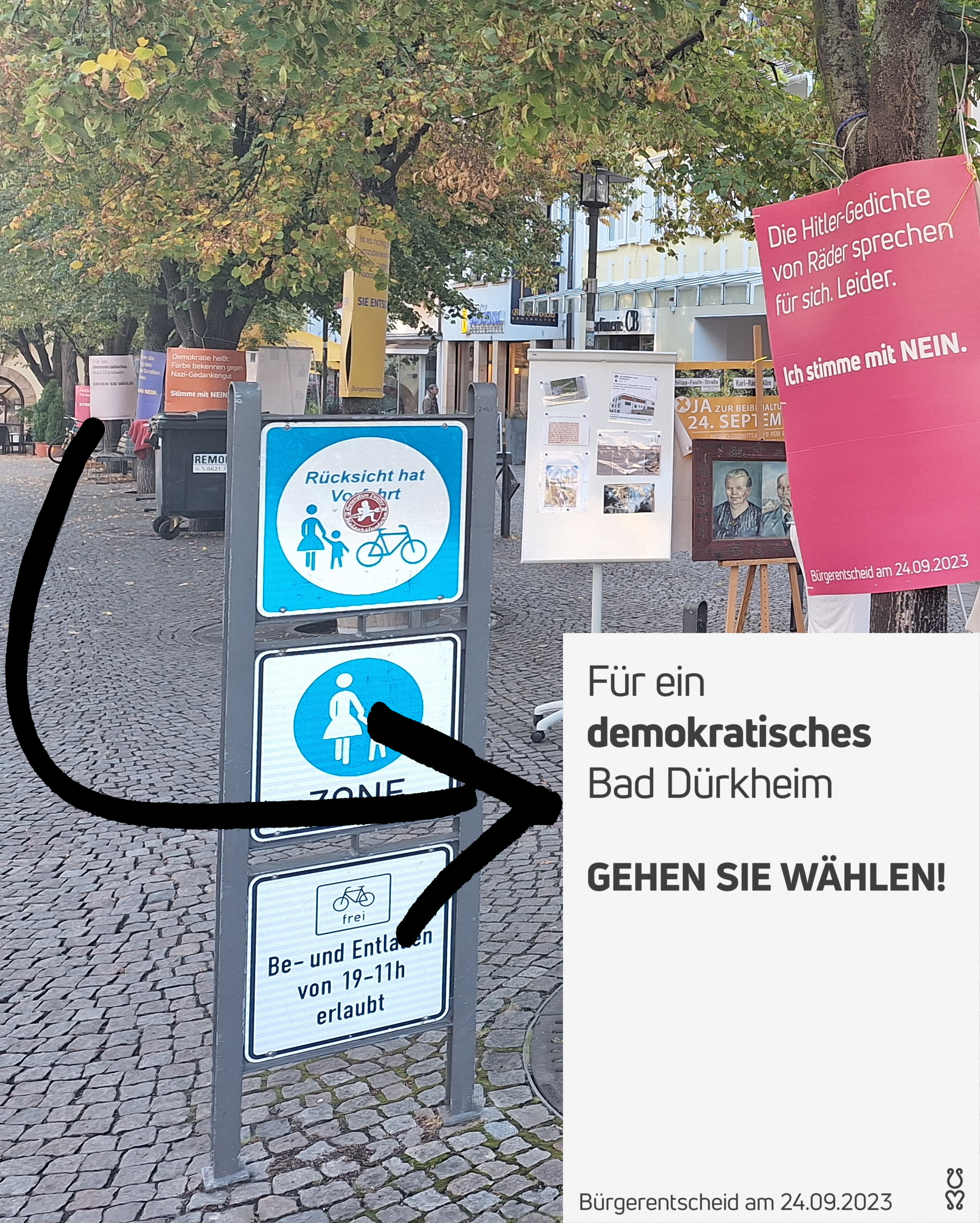 Auch die Stadt macht mobil und hängt stylische Plakate an Bäumen und Laternen rund um den Römerplatz auf, an ihre Follower im Internet verteilt sie grafisch gestaltete Werbebotschaften für den Meinungskampf auf Social Media, mit Slogans wie »Für ein demokratisches Bad Dürkheim. Gehen Sie wählen!« Konnte ich mir ursprünglich gar keinen Reim auf eine solche Aussage machen (Wollte jemand in Bad Dürkheim die Demokratie abschaffen?), so wurde mit den jüngsten »Aufstehen für die Demokratie«-Demonstrationen klar: »Demokratisch« sind nur noch die von den Regierungsparteien erwünschten Meinungen, andere Ansichten wie die der Umbenennungsgegner passen nicht mehr – siehe oben – zu einem demokratischen Gemeinwesen. Der infamen Absprechung der Zugehörigkeit zum demokratischen Meinungsspektrum könnten eines Tages auch noch »demokratiefördernde« Maßnahmen folgen, man will angesichts der aktuellen Gedankenspiele über einen »starken Staat« in Berlin und in Mainz gar nichts mehr ausschließen. Auch der Slogan »Andere haben mehr Ehre verdient« konnte nicht restlos überzeugen. Mit dieser Logik bekämen wir ein sehr dynamisches Straßenbenennungswesen, worüber nicht alle Straßenanwohner gleichermaßen erfreut sein dürften.
