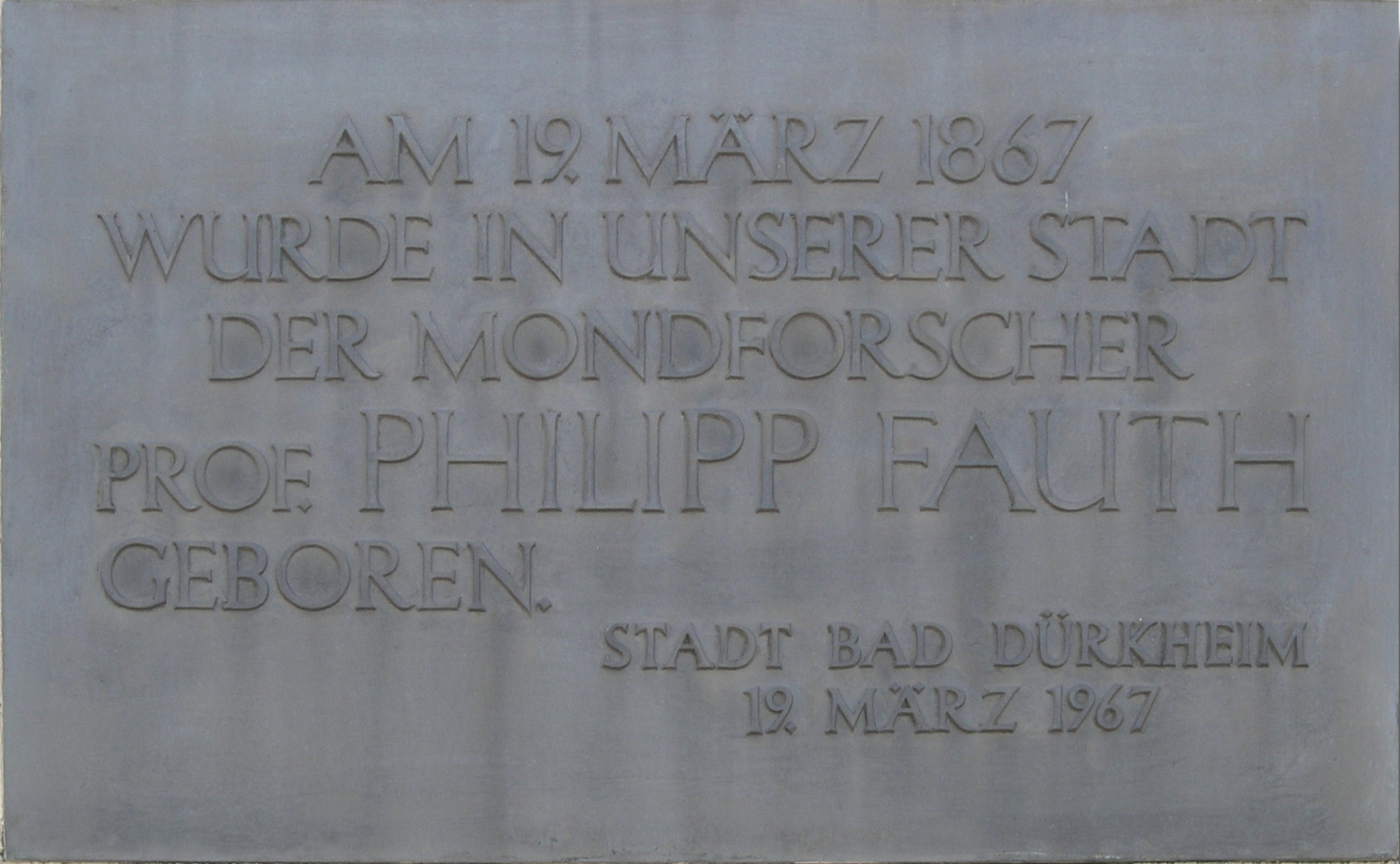 Philipp Fauth, geboren am 19.3.1867 in Bad Dürkheim, gestorben am 4.1.1941 in Grünwald. Volksschullehrer und Amateurastronom, widmete sein Leben der Kartografierung des Mondes, zeichnete durch bloße Beobachtung eine der größten und exaktesten Mondkarten. Ab 1937 war er Angestellter der Forschungsgemeinschaft Ahnenerbe, einer (späteren) Einrichtung der SS. Frühe persönliche Korrespondenz zeigt seine antidemokratische und antisemitische Einstellung.