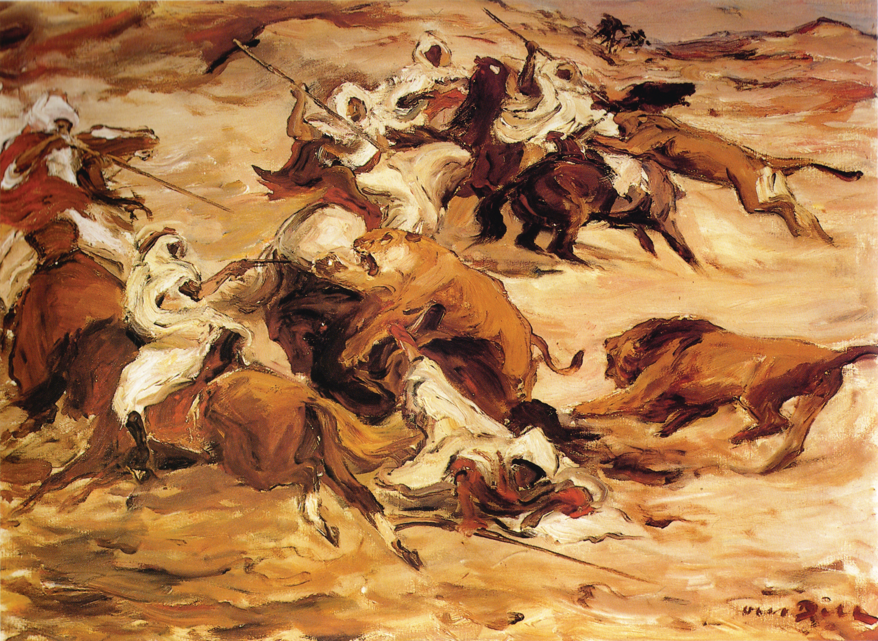 Die künstlerische Einordnung überlassen wir dem Otto-Dill-Museum in Neustadt: »Seine furiose Tiermalerei, seine dramatischen Stierkämpfe, seine Löwenstudien und Pferdeszenen, aber auch die Landschaften, mit ihrer kraftvollen Pinselführung, dem pastosen, impulsiven Farbauftrag und dem sinnlichen Rausch von sattem Rot, intensivem Gelb oder kräftigem Grün vertreten eindeutig expressive Tendenzen. Dill will die starke Bewegung der Tiere einfangen und erfasst in wenigen charakteristischen Zügen ihr Wesen. So entstehen Gemälde wie ›Pferderennen‹ oder die ›Löwenjagd‹ von 1926, in der Dill drei Wildkatzen und Beduinen mit ihren Pferden in einen heftigen Strudel entfesselter Kraft reißt. [. . . ] Im Spätwerk wendet er sich mit atmosphärischen Bildern wieder mehr dem Impressionismus zu.«